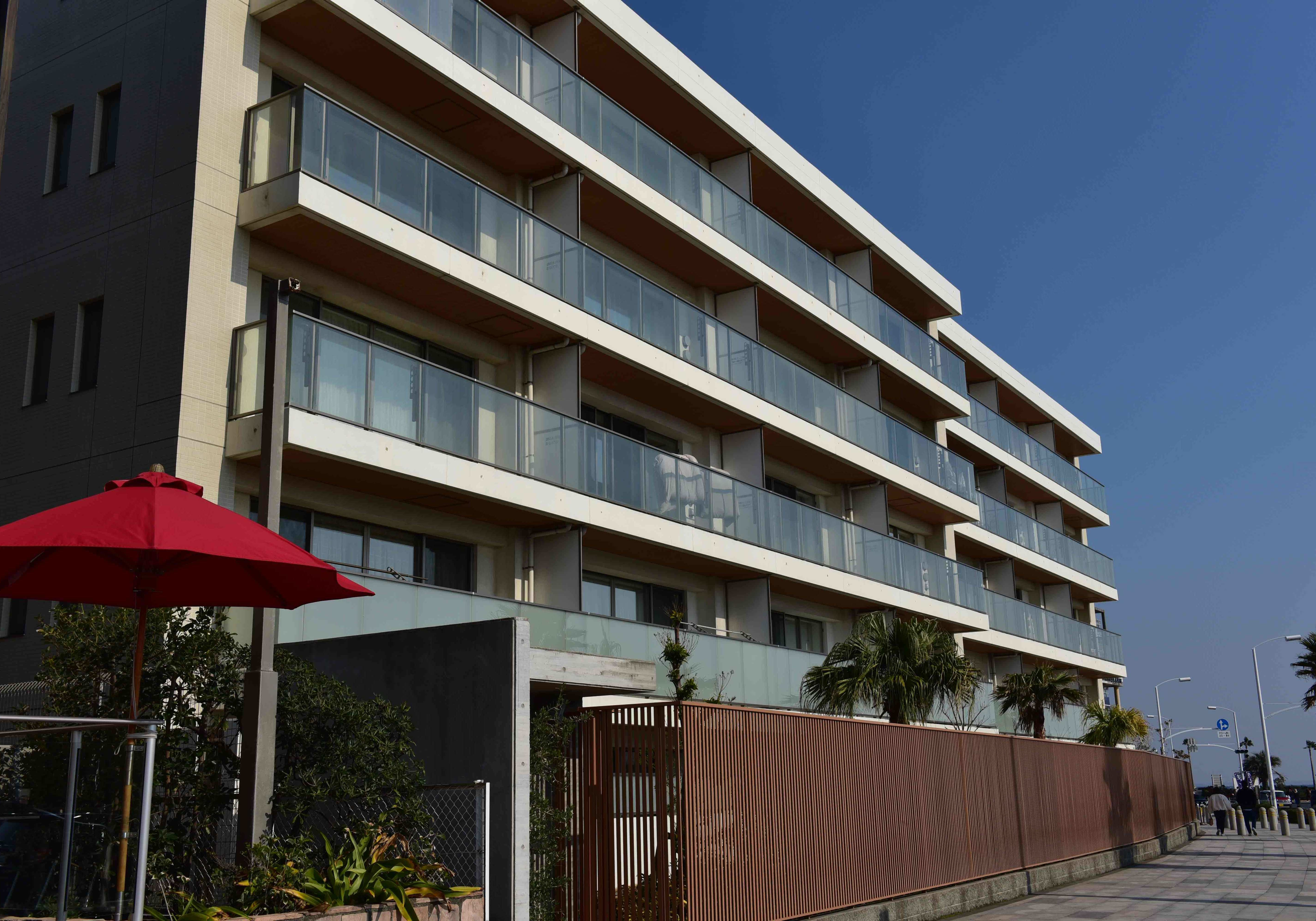 白いタイルとバルコニー裏は木調塗装でシンプルな外観です。
