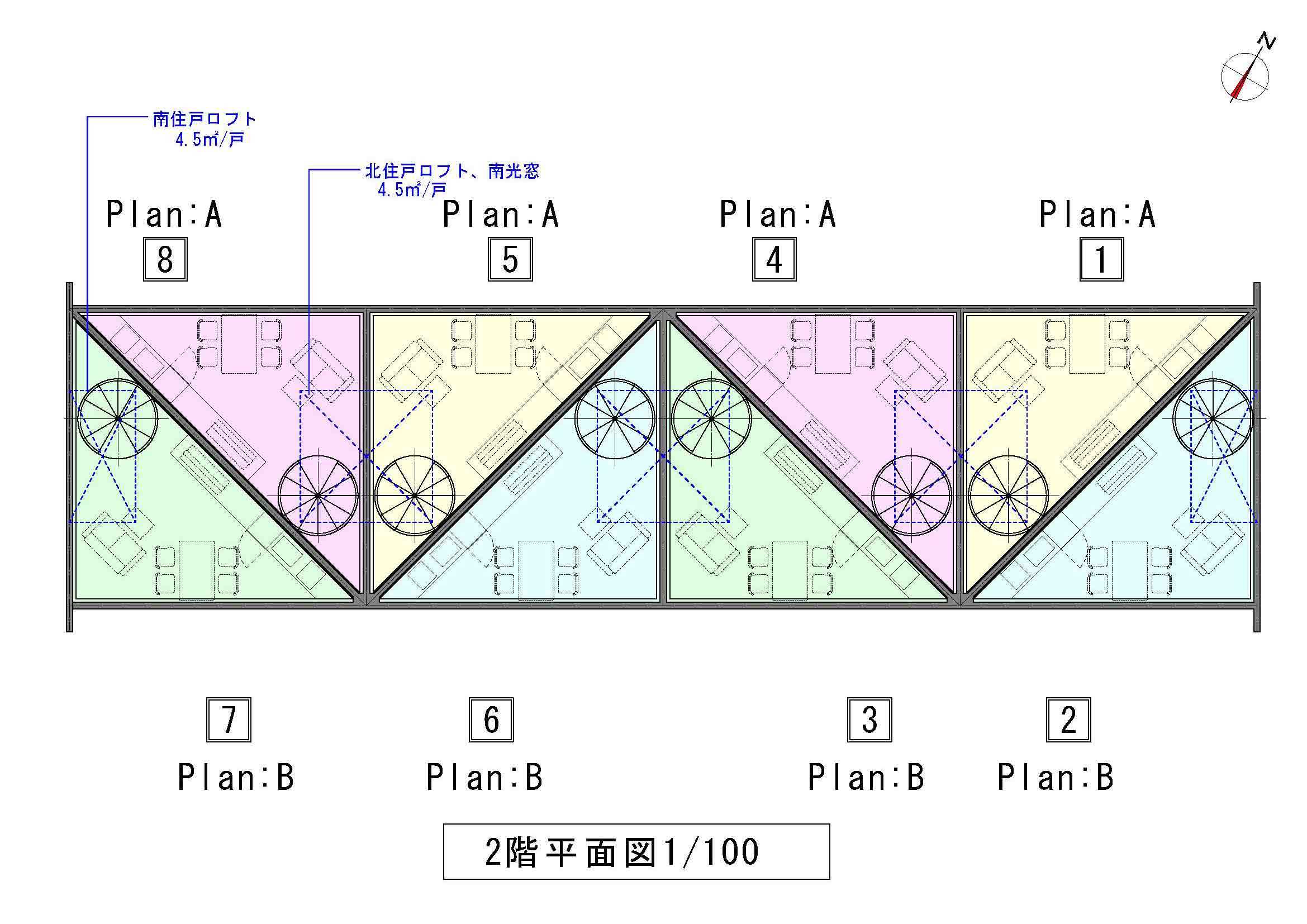 1・2階を三角形にし上下階ともに南北に大開口を設け、
