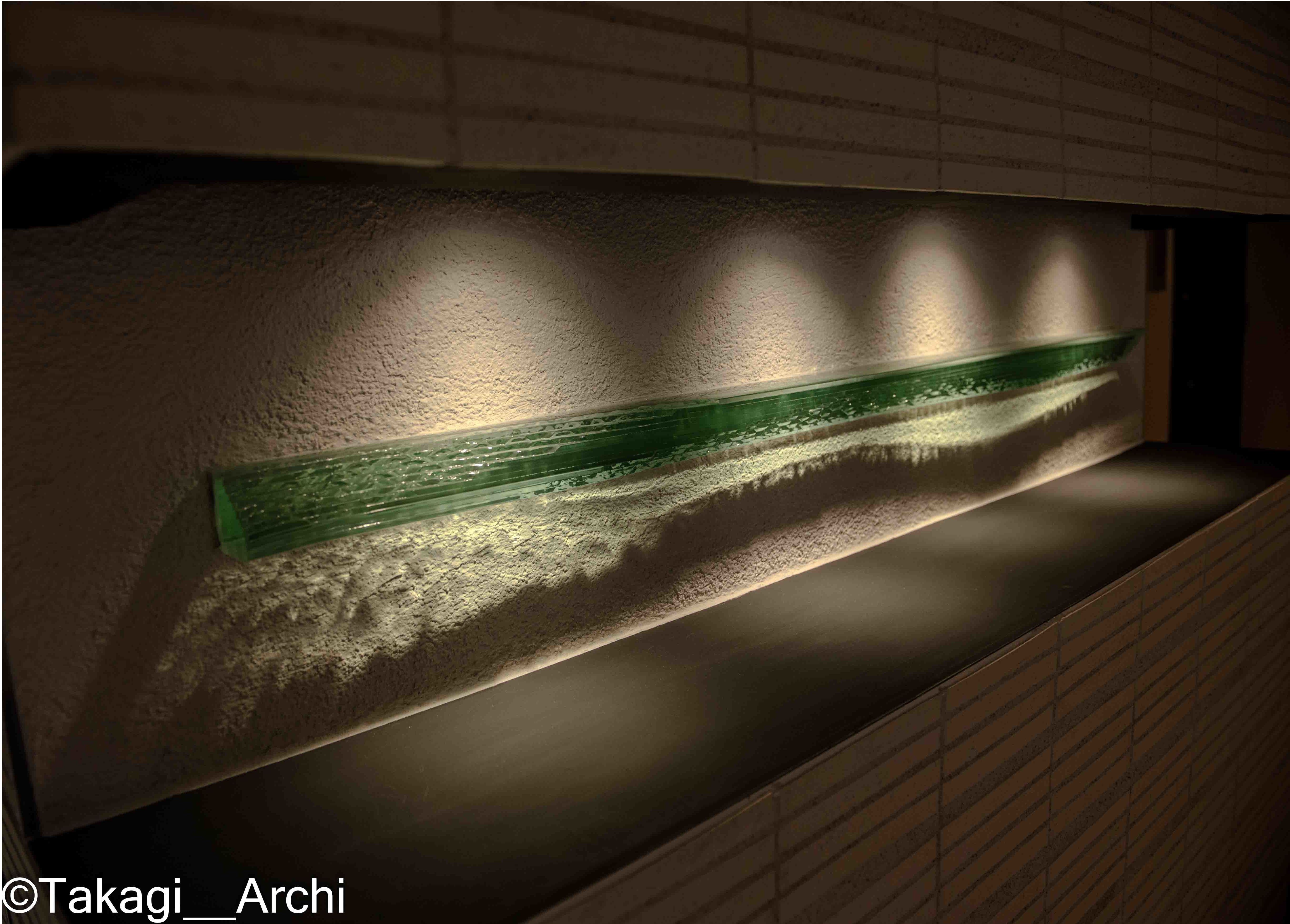 エントランスオブジェは普通ガラスを積層し溶融したものでコンセプトを表現しました